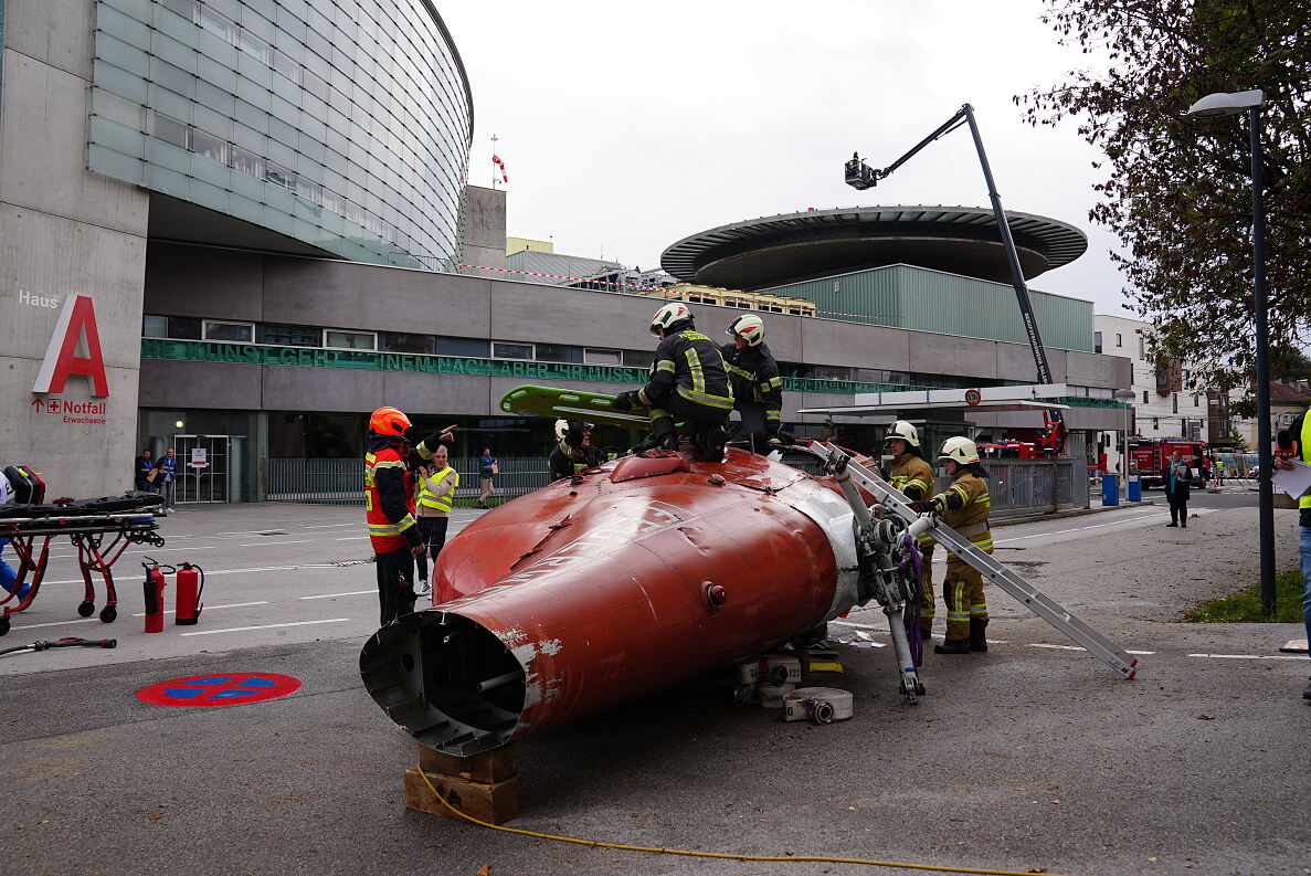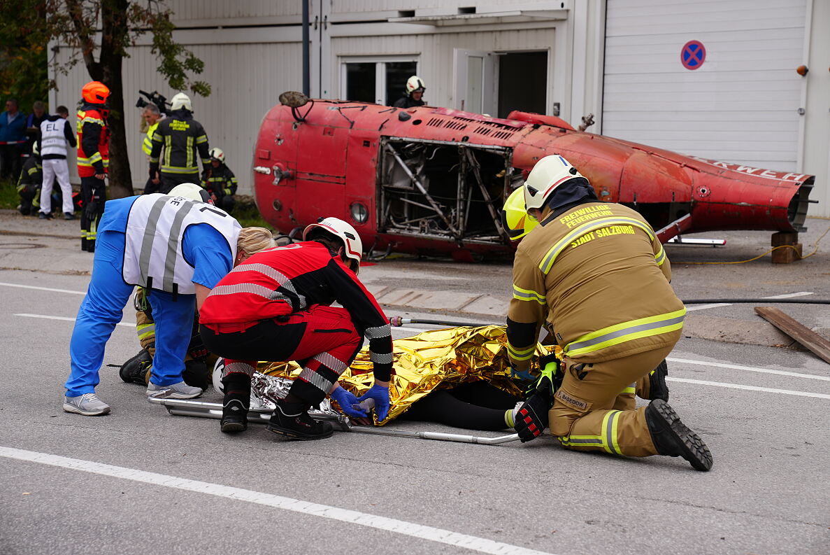 Ein Hubschrauber setzt nach einem technischen Gebrechen hart auf der Heliplattform der Chirurgie West auf und stürzt in der Folge auf den Boden hinunter. Es gibt 17 Verletzte, sechs davon schwerverletzt. Mit dieser Übungsannahme startete die große Einsatzübung am Mittwoch, 22. Oktober 2025, in den Salzburger Landeskliniken.