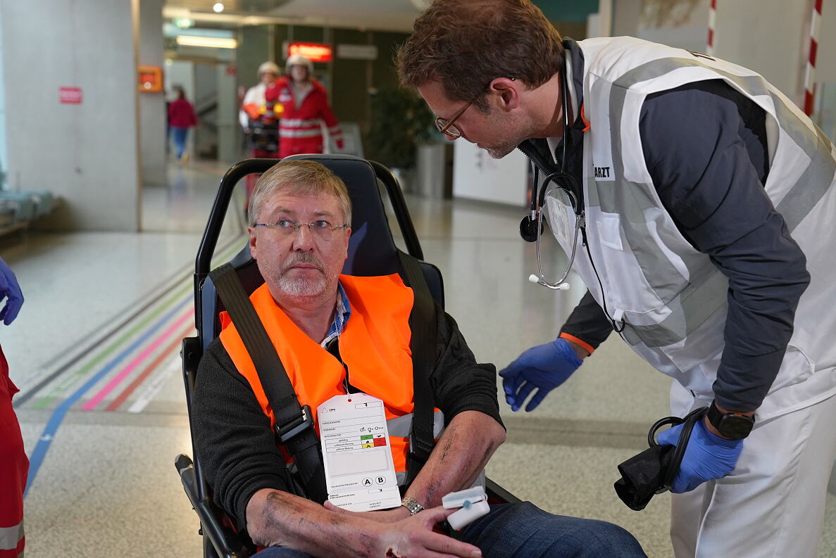 Berufsfeuer und Freiwillige Feuerwehr trafen nach wenigen Minuten am Schauplatz der Übung ein. Die Rettungskräfte des Roten Kreuzes übernahmen dann von ihnen die Verletzten und brachten sie zur Triage, also zur Einteilung nach Schwere der Verletzung, in die Chirurgie West. Dr. Wolfgang Fleischmann, der die Triage leitete, berichtete von einer herausfordernden Situation, 17 Verletzte in kurzer Zeit angeliefert zu bekommen und resümierte: „Es hat gut funktioniert. Jede Übung ist ein Gewinn.“
