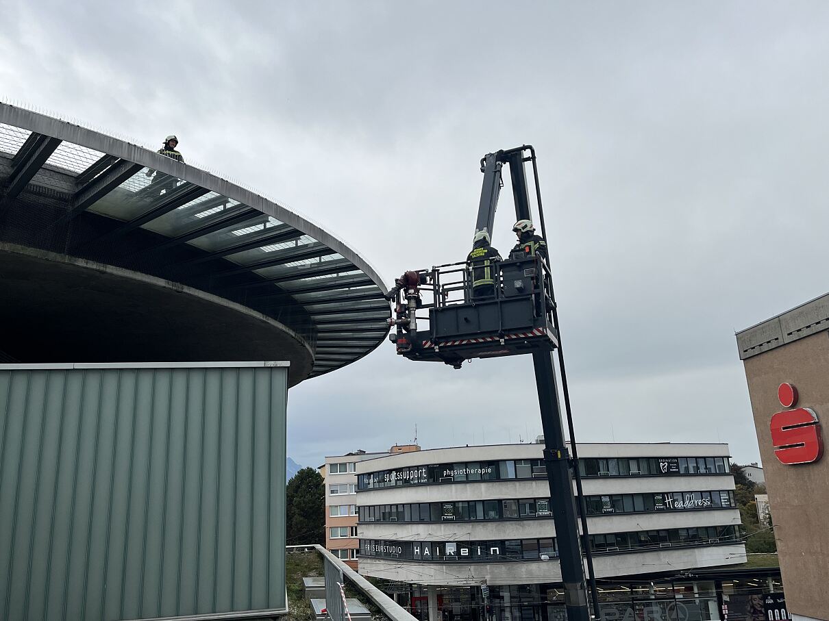 Spektakulär anzusehen war auch die Bergung zweier Verletzter von der Hubschrauberplattform der Chirurgie West. Sie wurden mit einer Hebebühne von einem Kran der Feuerwehr aufgenommen und sicher auf den Boden gebracht.